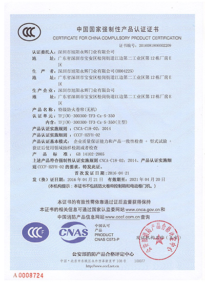深圳市旭阳永辉门业有限公司是专业设计、生产、安装防火卷帘系列产品的民营企业。公司致力于新产品及技术的研发,利用自有的资金、技术、管理和营销网络上的优势;凭借深圳改革开放的先机,秉承“诚信、创新、服务、有责任感的企业理念;坚持以“科技为先导、质量求生存、信誉得市场、管理出效益”的指导思想;严格执行国家和行业标准。防火卷帘门系列产品通过中国公安部消防产品合格评定中心的型式认证,顺利通过国家新标准GB14102-2005的检测。
